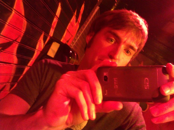 Guy with eyebrows and a phone take a picture in secluded party spot. |