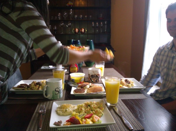 The dark haired woman served a big breakfast to her family. |