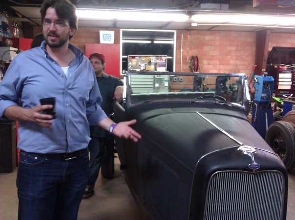 A man in a nice blue shirt holding a beverage, showing off a nice vintage vehicle. |