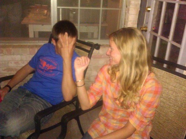 Two friends resssed in casual clothes share a laugh, though the boy appears to be embarrassed and is hiding behind his hand. |