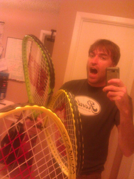 A man showcasing a bunch of tennis rackets, using the mirror to take a selfie. |