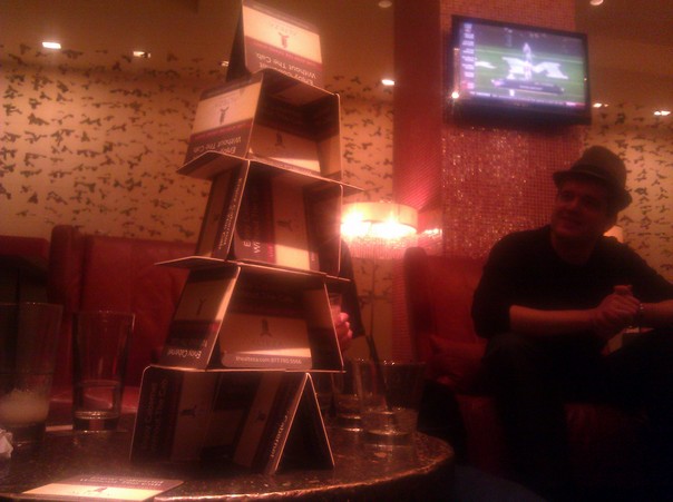 A man with a hat in a dimly-lit bar looks at a pyramid of menus while under a tv. |