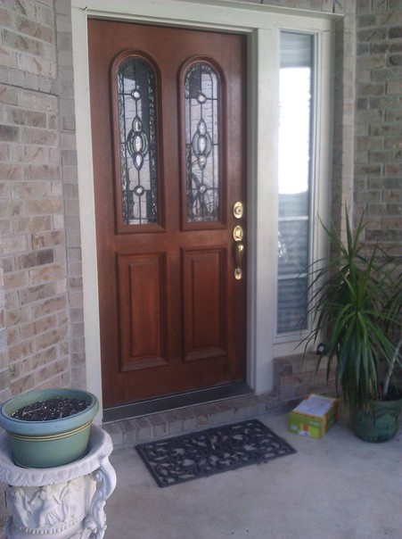 A package, flower pot, potted plant, and welcome mat in front of a door leading into a residence. |