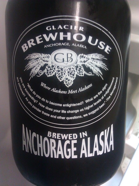 This appears to be a bottle of beer in a black bottle with white text that says "Glacier Brewhouse Anchorage, Alaska Brewed in Anchorage Alaska" with some other text and illustrated hops and barley.