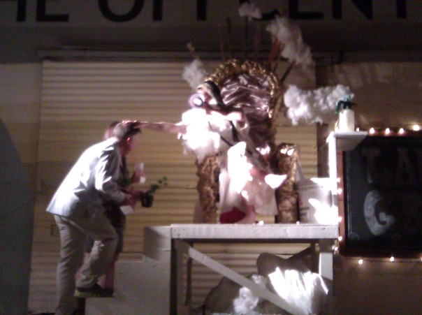 A man and a woman walking up the stairs of a very nice homemade set. |