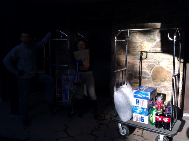 Couple standing next to two luggage racks containing soda, beer and ice. |