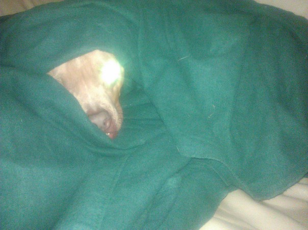 The nose of a sleepy white dog poking out from a green fuzzy blanket. |
