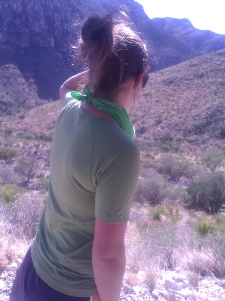 A woman is shielding her eyes from the sun and looking over a mountain. |