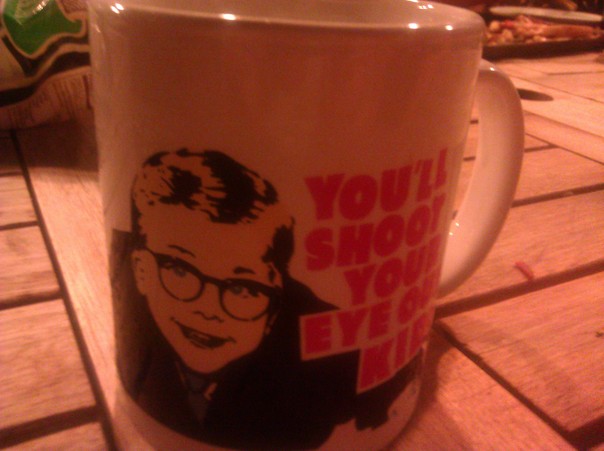 There is a cup on a surface that has the kid from "A Christmas Story" on it with the saying "You'll Shoot Your Eye Out Kid". |
