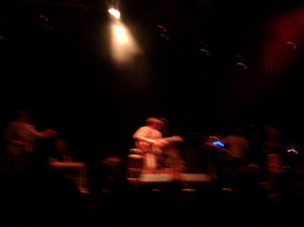 A concert is going on here some artists are performing with their musical instruments like guitar,keyboard.A light is hanged on the top. |