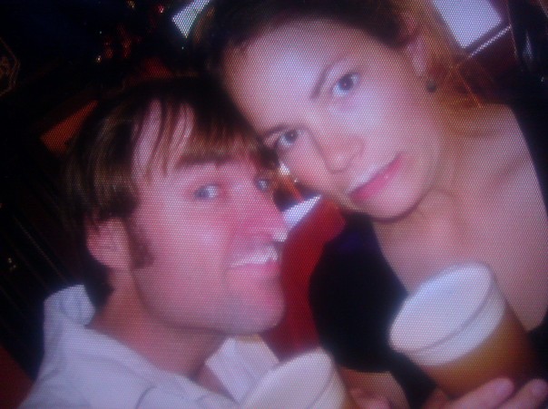 A man with a cream mustache and woman posing for a very goofy photograph. |