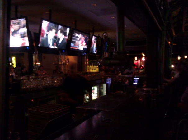 A bartender is at work under the glare of four television screens in a sparsely patronized bar. |