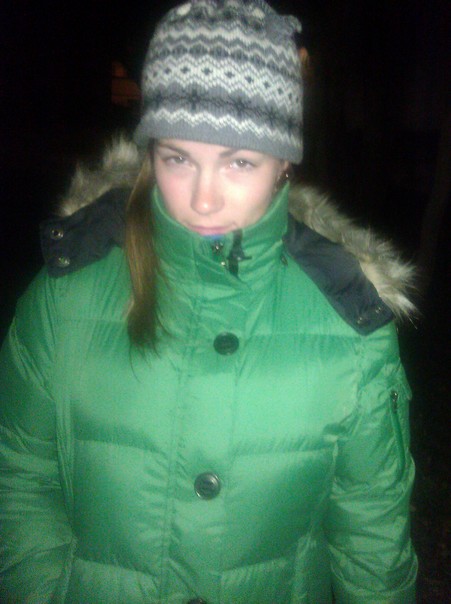 A young woman is shown in cold weather wearing a green parka and beenie. |