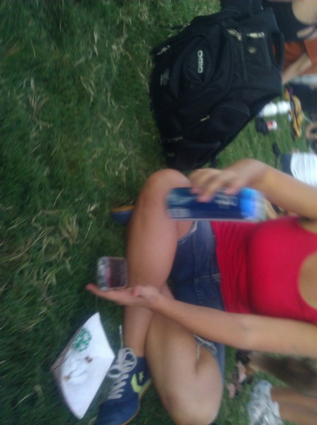 women sitting on lawn checking her mobile phone. |