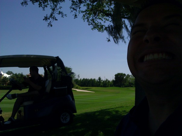 The man is faking a huge smile while he takes a picture on a golf course. |
