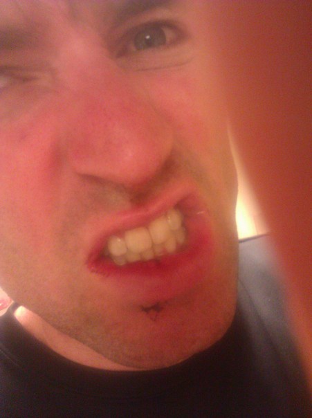 A man making a sinister goofy face while he is relatively close to the camera. |