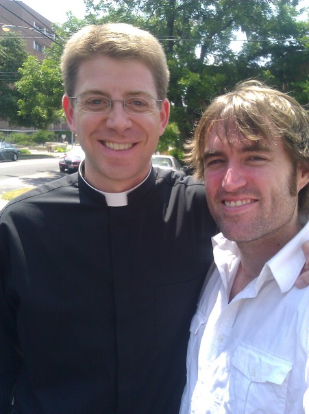 A close-up shot of two white men smiling for the camera while standing in a parking lot; the man on the left is a catholic priest wearing glasses. |