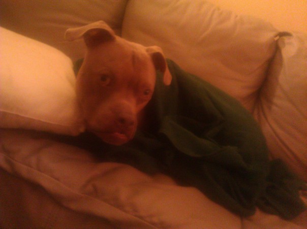 A dog lays on a leather couch wrapped in a blanket to stay warm. |