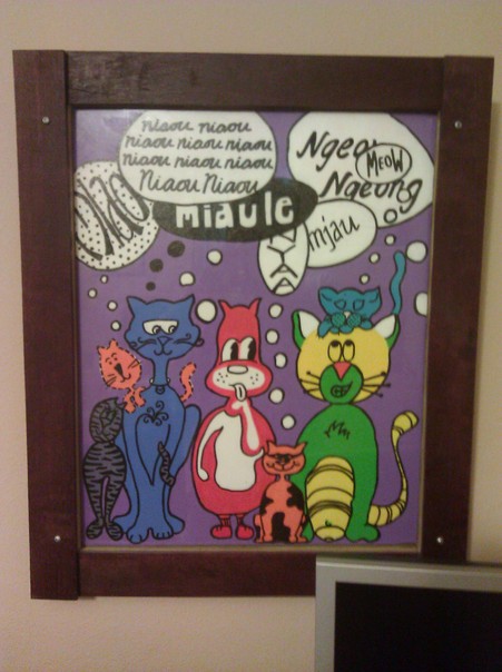 A cartoon picture of three cats and three kittens sitting together |
