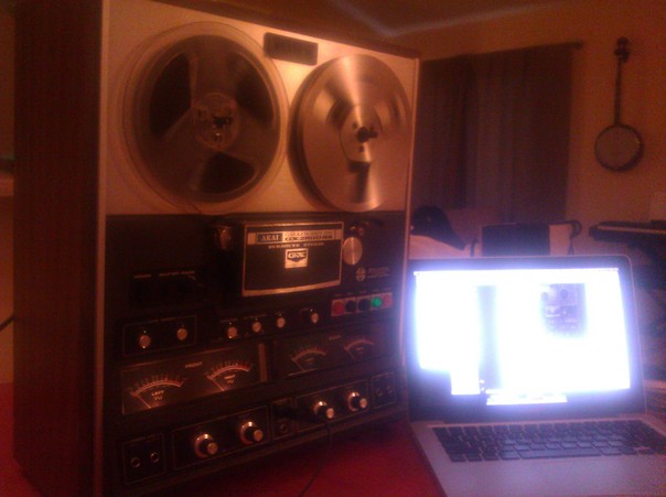 An old recording studio where music are recorded with a laptop |