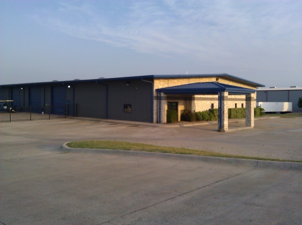 A bright blue sky with wisps of clouds hangs above a large tan bricked building. |