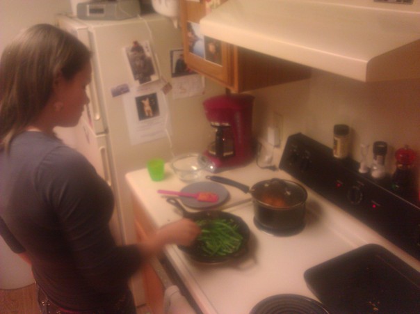 A woman is cooking dinner in her small cramped kitchen. |