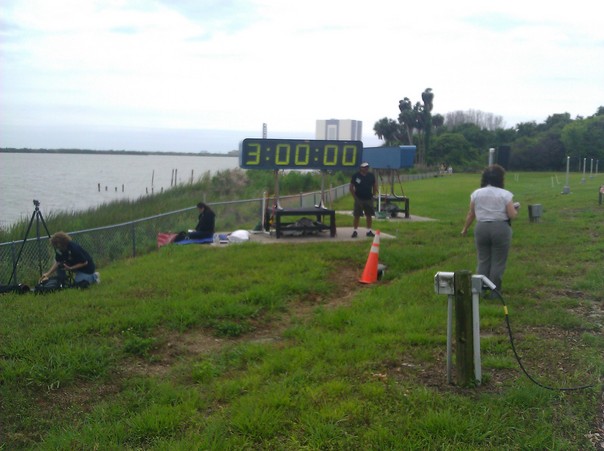 A group of people prepare for an outdoor race in a park that sets by a beautiful river. |