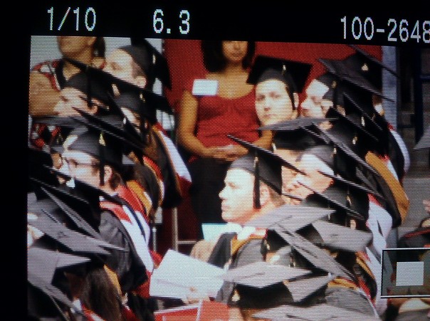 Dozens of college graduates are sporting their black caps and gowns. |