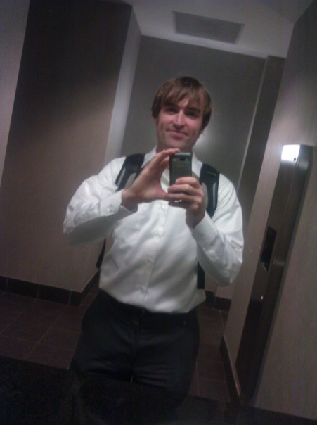 A young white man in a white dress shirt and dark dress pants taking a picture of himself in a mirror. |