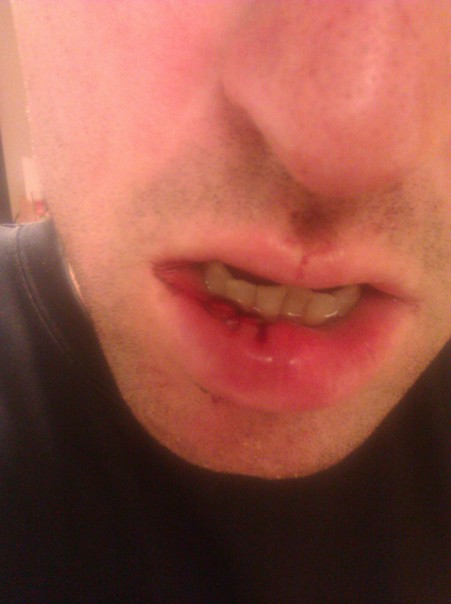 Man with a bloody lip and probably broken teeth wearing black shirt. |