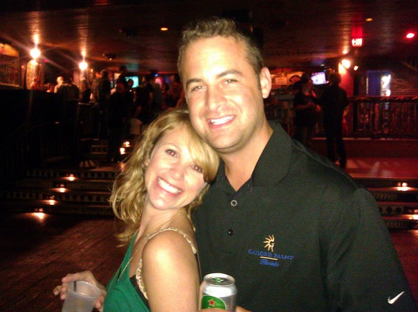 A young couple poses for a picture in the middle of a night club. |