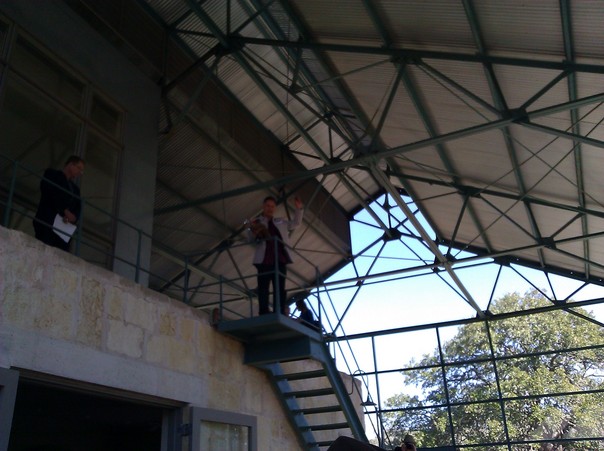 There is a man waiving standing at the top of an outdoor stairwell. |