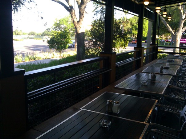 A series of tables with salt and pepper shakers are arranged in a row next to a street. |