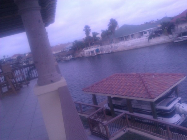 It is a cloudy image of a river running through the city with boats parked to the sideways ready to to be used. |