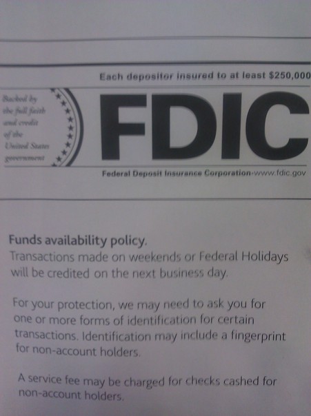 There is a sign explaining below the FDIC letters the funds availability policy. |