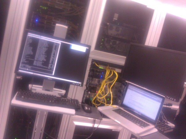 Computers in use at work stations in the IT departments server room.