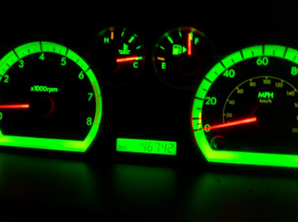 Picture of a car dashboard showing an odometer reading of 46742 and an almost full tank of gas.