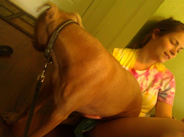 There is a brown dog with a woman in a tie-die T-shirt in the background.