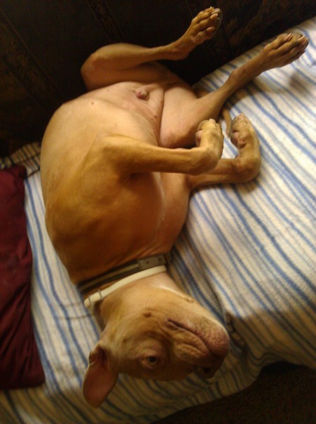 a picture of a dog relaxing on a bed waiting for its belly to be rubbed.
