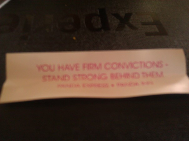A fortune cookie fortune that reads "you have firm convictions - stand strong behind them"