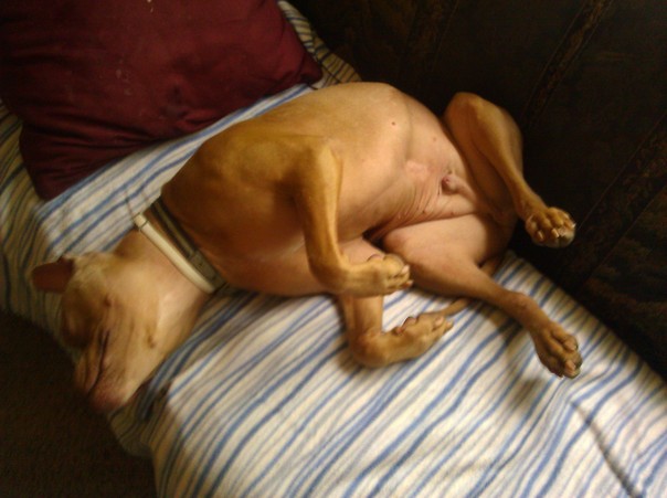 The dog sleeping on the couch is in a very embarrassing pose.