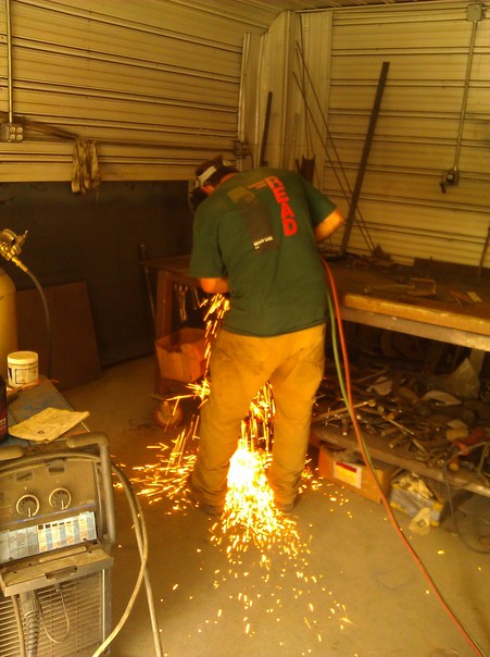 A man in a green shirt welds something while wearing a shield mask over his face.