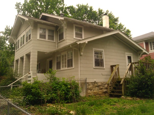 A light beige siding house with a short outdoor steps to side door is framed by irregularly shaped shrubbery.