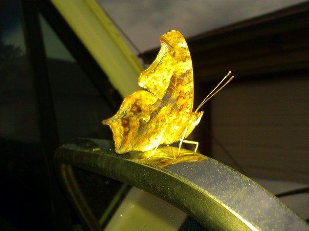 The butterfly that is perched on the arm of the chair has an almost golden glow to it as it reflects the light.