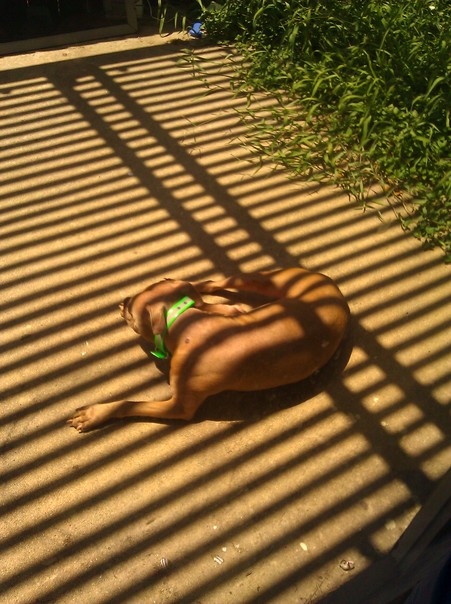 A light brown dog is basking on the ground with strips of shadow breaking up the sunlight on and around him.