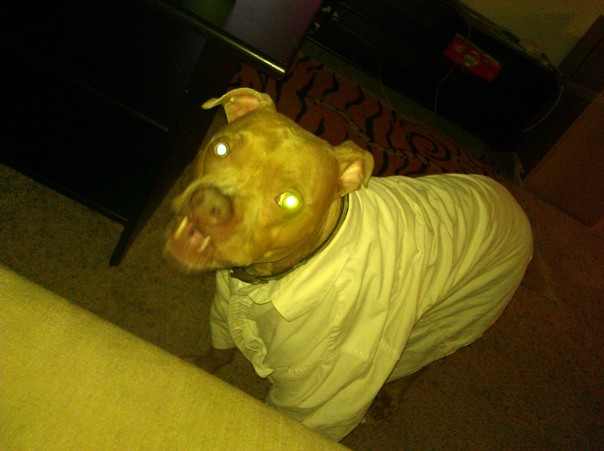 A dog is wearing a formal white shirt, standing next to a couch.