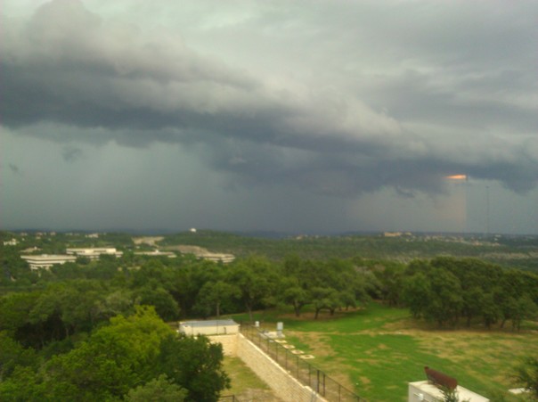 A shot of dark rain bearing clouds passing over a area with a small wood beside a fenced area.