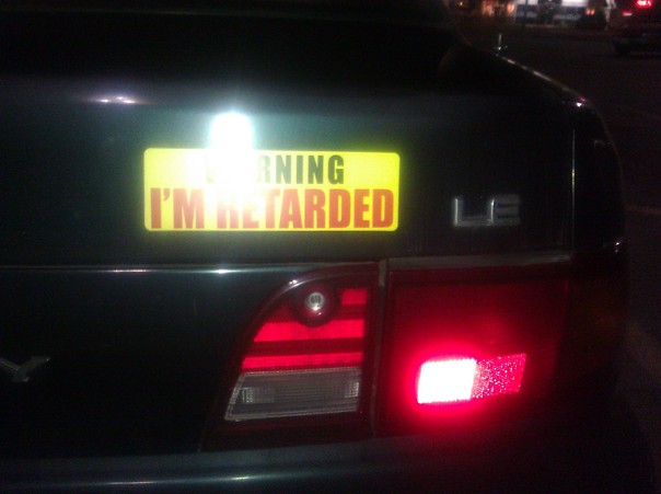 The yellow bumper sticker warns that we are not all perfect