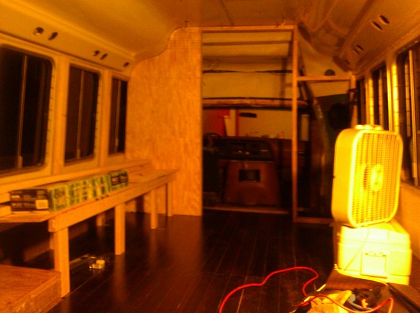 A poorly lit photo of the inside of a RV during a Do It Yourself reconstruction.