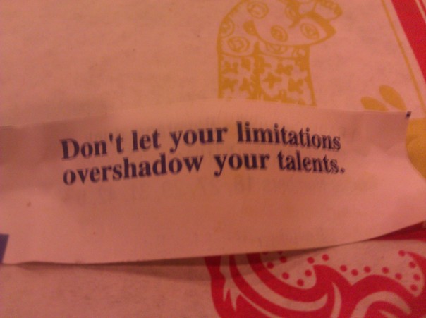 A fortune cookie paper reads "Don't let your limitations overshadow your talents."
